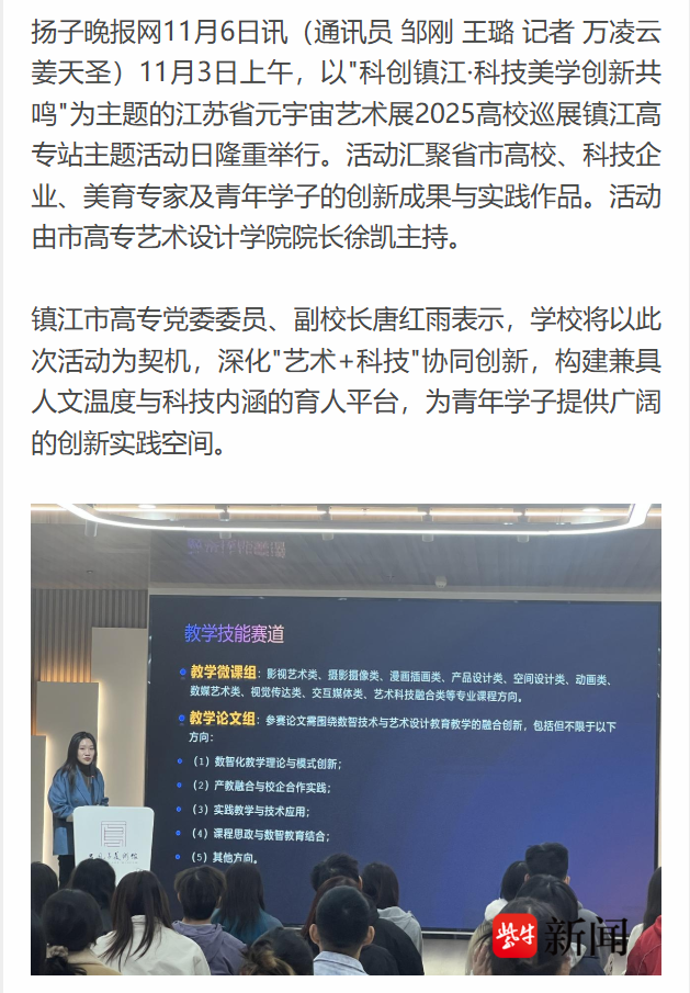 紫牛新闻|科创镇江・艺科共鸣!江苏省元宇宙艺术展 2025 高校巡展镇江高专站启幕 信息来源:宣传部发布时间:25.11.10阅读次数:6366 媒体链接:紫牛新闻:https://wap.yzwb.net/wap/news/4840132.html