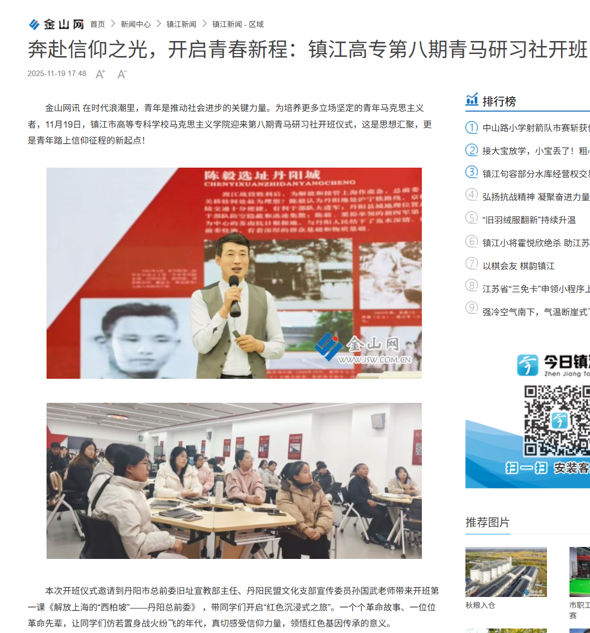 金山网|奔赴信仰之光,开启青春新程:镇江高专第八期青马研习社开班 信息来源:马克思主义学院发布时间:25.11.20阅读次数:741 媒体链接:金山网:https://www.jsw.com.cn/2025/1119/1932726.shtml
