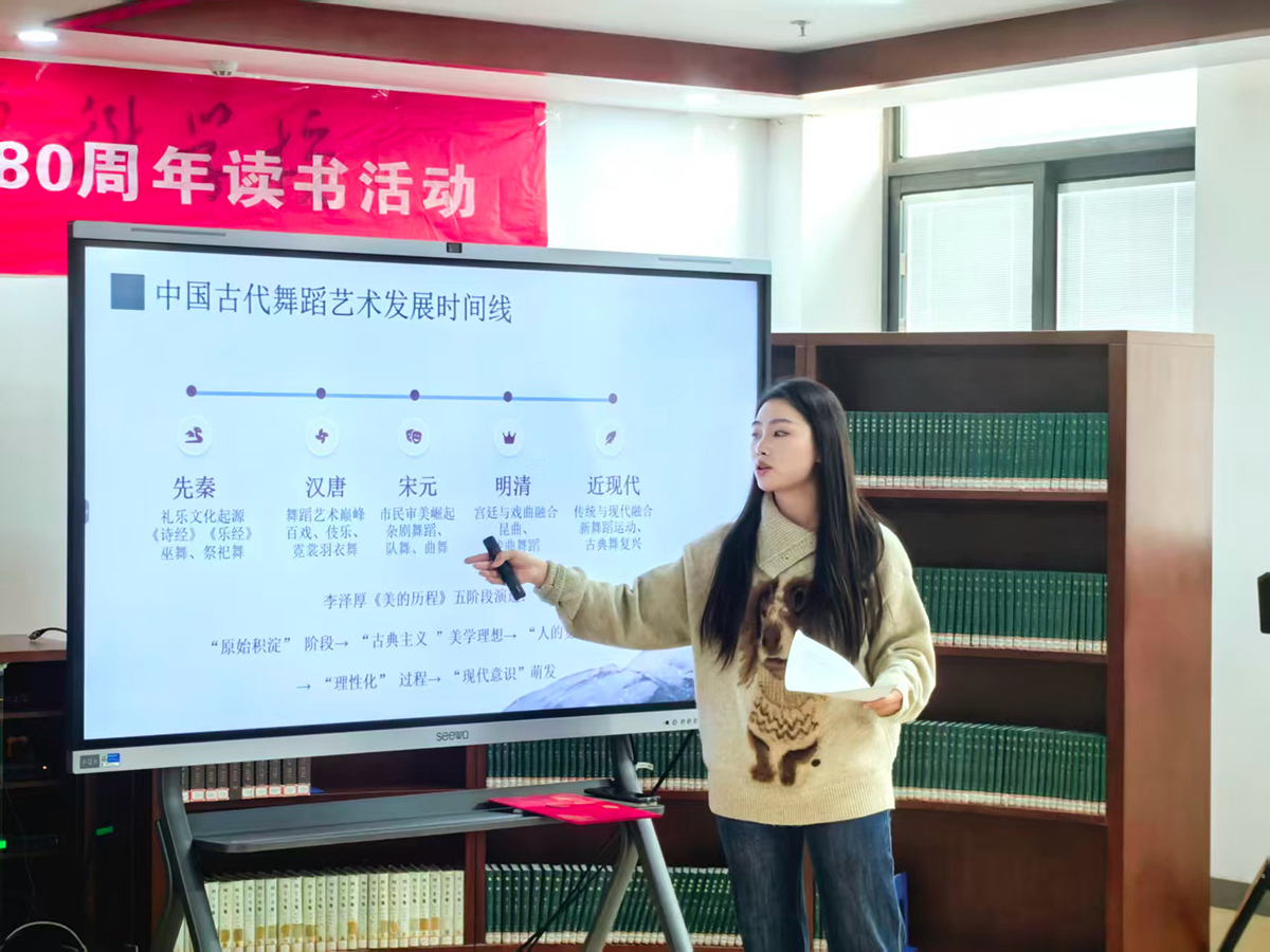 12月11日,我校“悦读经典”读书会第二十五期分享活动在图书馆文学欣赏室顺利举行。本期活动聚焦李泽厚先生的经典美学著作《美的历程》,特邀主讲人通过中国古代舞蹈艺术这一独特视角,引领师生进行了一场跨越时空的美学对话。丹阳师范学院副院长高飞燕、现教中心副主任束锁平及师生代表参与了本次活动。 活动伊始,现教中心副主任束锁平代表学校为本期主讲人谢玉金老师颁发“阅读推广人”聘书,以此表彰并鼓励其在推