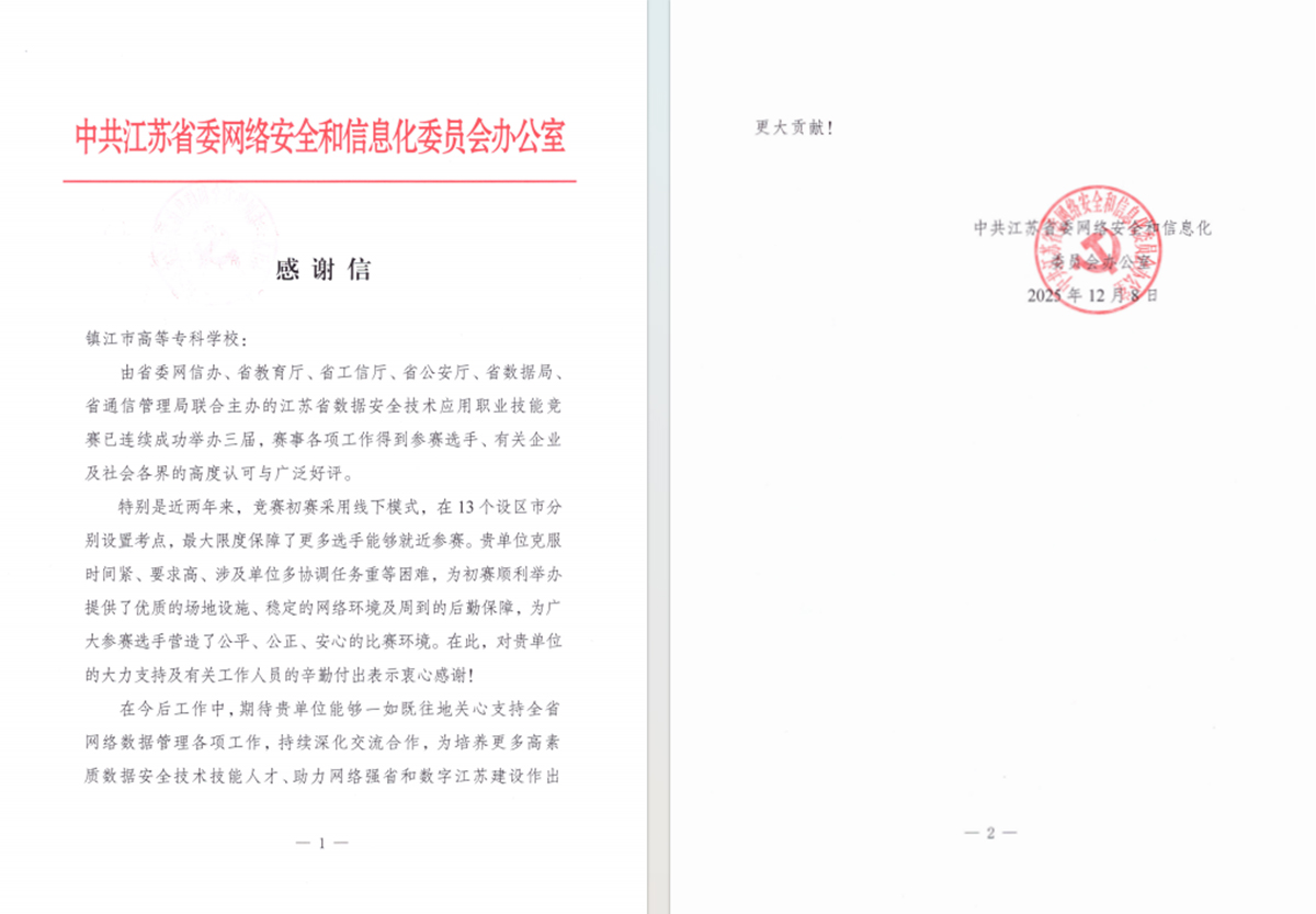 2025-12-18近日,中共江苏省委网络安全和信息化委员会办公室向我校发出感谢信,对我校近年来在江苏省数据安全技术应用职业技能竞赛中提供的重要支持表示衷心感谢。 江苏省数据安全技术应用职业技能竞赛由省委网信办、省教育厅、省工信厅、省公安厅、省数据局、省通信管理局联合主办,已连续成功举办三届,受到参赛选手、企业及社会各界的广泛好评。 我校图文信息中心近年来积极承办此项竞赛的市级选拔赛。在省网络安全学会、市委网